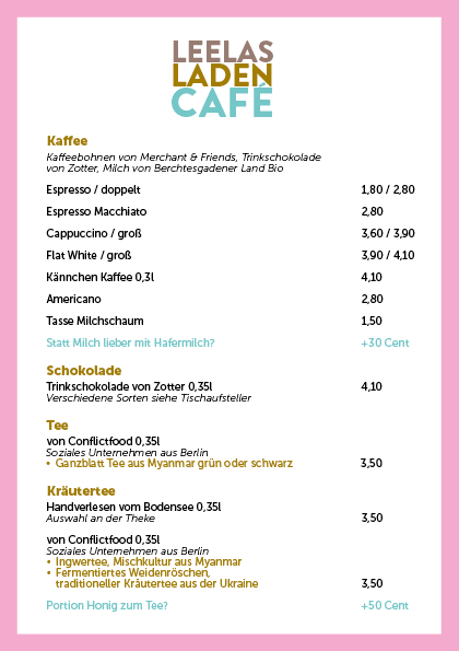 Genieße bei uns kleine Speisen, guten Kaffee und erfrischende Getränke aus regionalen, hochwertigen Zutaten. In unserer gemütlichen Atmosphäre sind alle Menschen willkommen. In den Regalen haben wir eine wechselnde Auswahl unserer Produkte ausgestellt. Lasst die Seele baumeln und habt schöne Momente.